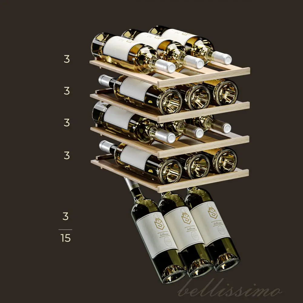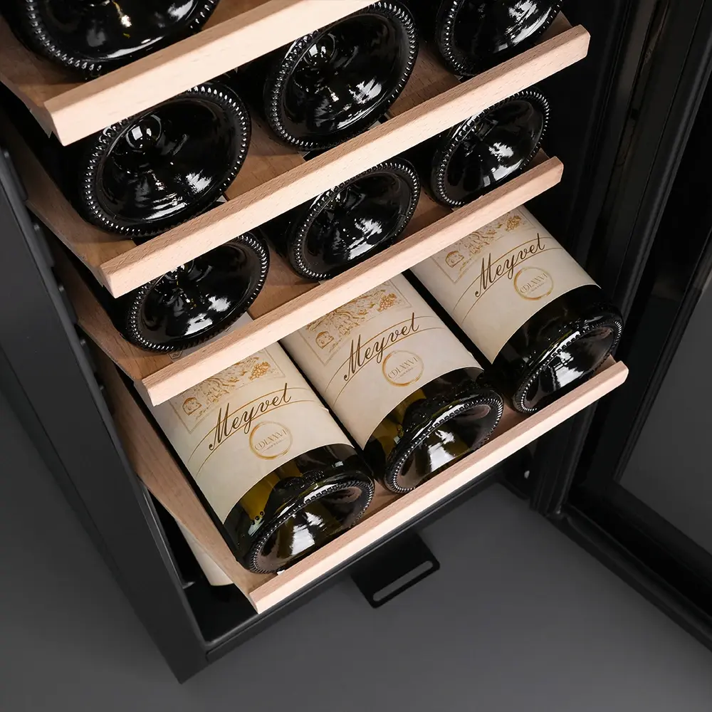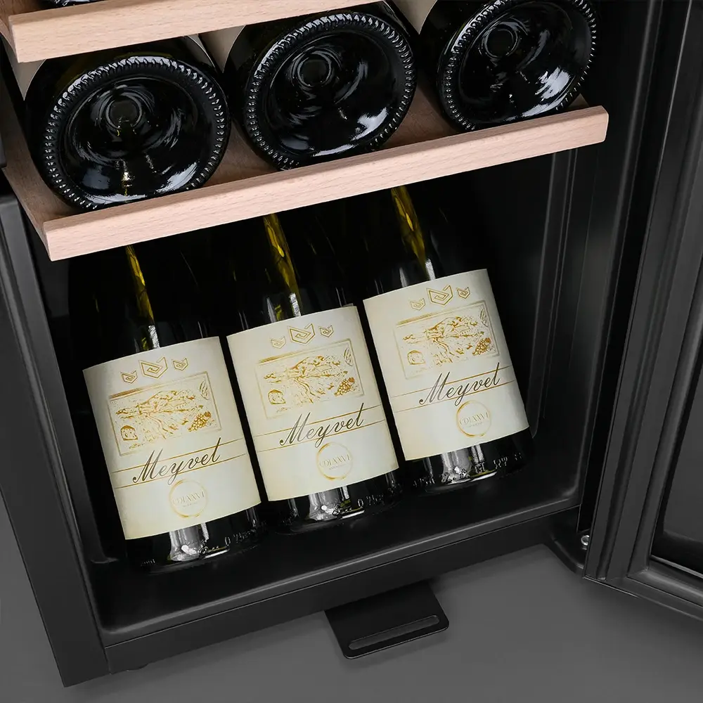 Выдвижные и демонстрационная полки дают возможность грамотно организовать хранение бутылок и создать впечатляющую презентацию вашей коллекции вин.
