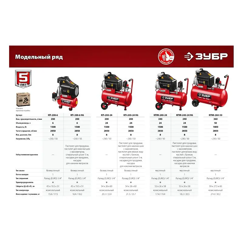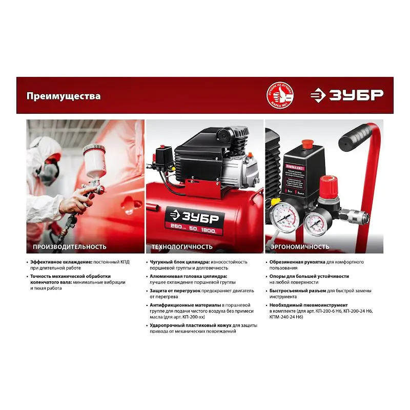Воздушный компрессор ЗУБР КПМ-260-50 из серии «Мастер» нагнетает в пневмоинструмент сжатый до 8 атм воздух с производительностью до 260 л/мин. Модель с ресивером объемом 50 л используется с краскопультами, пневматическими гайковертами, устройствами для накачки, продувки и прочим оборудованием.