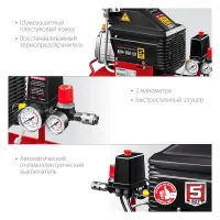 Быстросъемный штуцер упрощает подсоединение пневмоинструмента. Шумозащитный пластиковый кожух делает работу более комфортной. С помощью колес и обрезиненной ручки прибор легко перемещать по площадке. Резиновая опора снижает уровень вибрации и повышают устойчивость пневмокомпрессора.