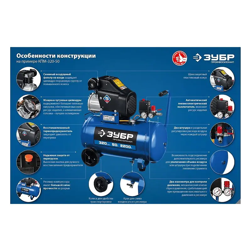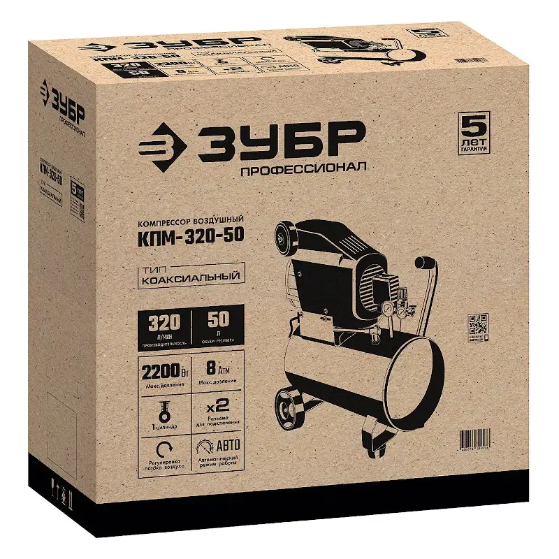 Воздушный компрессор ЗУБР КПМ-320-50 мощностью 2200 Вт используется для снабжения пневматического инструмента сжатым воздухом под давлением до 8 бар. Модель с производительностью 320 л/мин и ресивером на 50 л повышает эффективность работы в мастерской, гараже, на производстве и в строительстве.