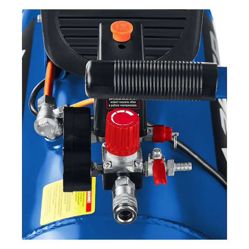 Работа компрессора ЗУБР КПМ-320-50 автоматически регулируется с помощью реле давления, которое отключает двигатель при достижении 8 бар в ресивере. Когда, по мере расходования запасенного в баллоне воздуха, давление снижается до предустановленного минимума, автоматика снова запускает двигатель. Рабочее давление можно регулировать перед подачей сжатого воздуха к инструменту. При выходе из строя реле давления излишки воздуха стравливаются через предохранительный клапан. Манометры позволяют контролировать давление в ресивере и в рукаве быстросъемного штуцера.