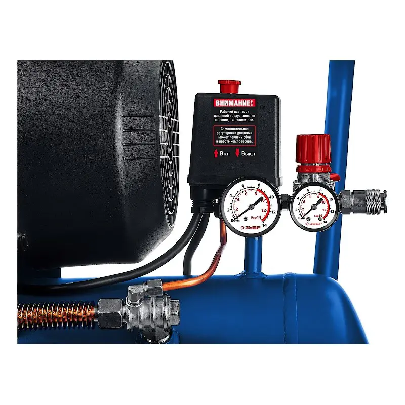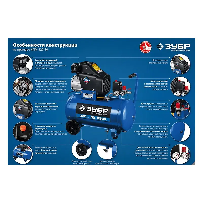 Воздушный компрессор ЗУБР КПМ-400-50 из профессиональной серии нагнетает в пневмоинструмент сжатый атмосферный воздух со скоростью до 400 л/мин. Модель с максимальным давлением 8 атм эффективна в автомастерской, на стройплощадке, в производственном цехе.