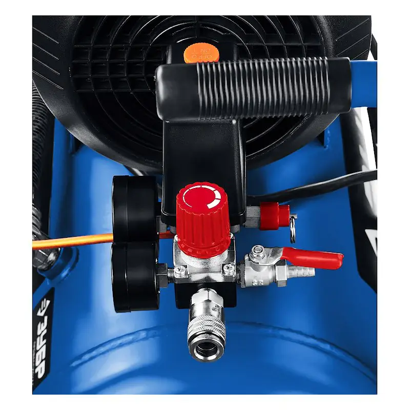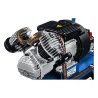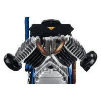 Масляный компрессор оборудован двигателем мощностью 2,2 кВт, который стабильно поддерживает до 2850 об/мин. Два чугунных цилиндра, рассчитанных на высокую тепловую нагрузку, увеличивают рабочий ресурс устройства. Алюминиевая V-образная головка и воздуховод с ребристой поверхностью способствуют лучшему охлаждению. Масляная смазка повышает устойчивость элементов поршневой группы к износу и продлевает срок их службы. Компрессор надежен за счет простой конструкции коаксиального привода.