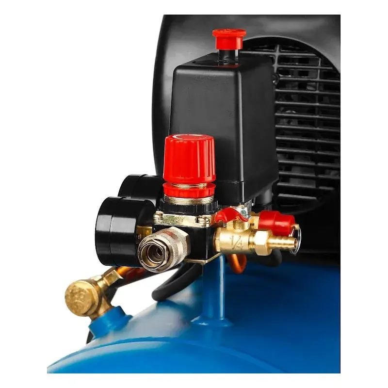 Максимальное давление составляет 8 бар. Регулировка обеспечивает работу с нужным показателем. Манометры на корпусе позволяют следить за внутренним и выходящим давлением. Термопредохранитель обезопасит компрессионную установку от перегрева.