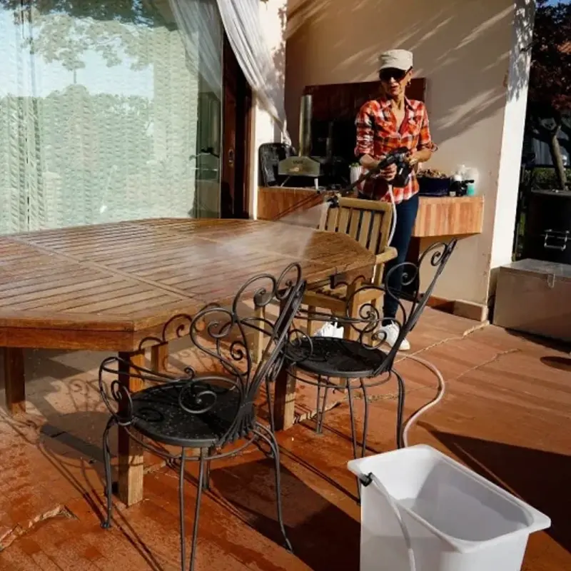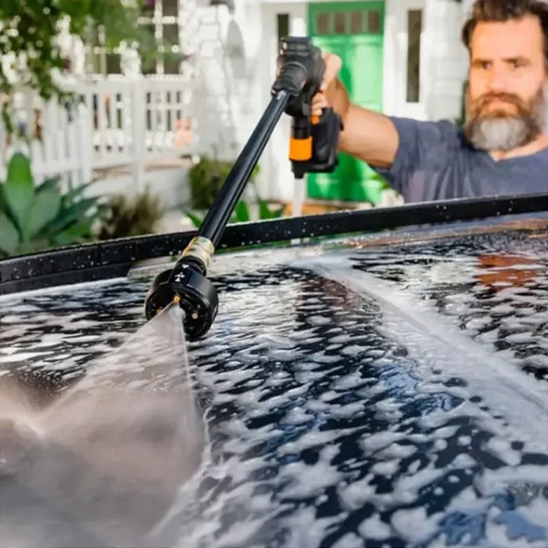 Длинный 6-метровый шланг позволяет забирать воду из расположенного поблизости водоема, бочки или ведра. Угол распыления водной струи можно регулировать непосредственно на распыляющей насадке. Экономичный режим с рабочим давлением 25 бар используется для полива. Для эффективной очистки поверхностей и удаления стойкой грязи используется турборежим и моющее средство. Легкую и компактную аккумуляторную мойку высокого давления WORX удобно переносить. Она не занимает много места при хранении или перевозке в багажнике автомобиля.