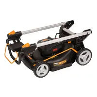 Самоходная аккумуляторная газонокосилка WORX оснащена регулятором скорости. Вы можете выбрать комфортный для себя темп перемещения и работать, вдыхая свежий воздух без примеси выхлопных газов. Два прижимных рычага отвечают за управление приводом на колеса и включение режущего механизма. Высота среза легко регулируется путем перестановки одного рычага.