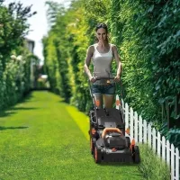 Аккумуляторная газонокосилка оснащена технологией IntelliCut, обеспечивающей эффективность кошения в любых условиях. В зависимости от густоты и однородности газона электроника регулирует число оборотов электродвигателя. Поддерживаются два режима: TURBO для резки высокой и плотной травы, ECO — для регулярного ухода. Высоту скашивания можно изменять с помощью рычага на переднем колесе. Возможны шесть положений в диапазоне от 20 до 70 мм. Травосборник оснащен наглядной индикацией, подсказывающей, когда необходимо опорожнить контейнер. Состояние заряда перед запуском или после использования устройства можно проверить, нажав кнопку POWERTEST на аккумуляторном отсеке.