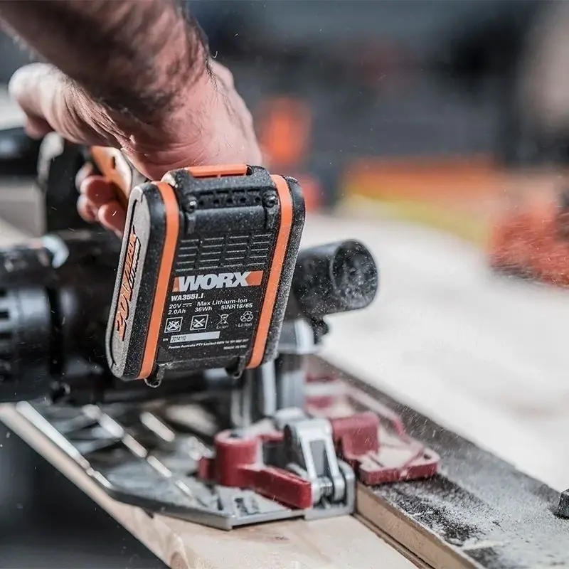 Циркулярная пила питается от аккумулятора PowerShare напряжением 20 В. В комплекте предусмотрены батарея емкостью 2 Ач и зарядное устройство. АКБ подойдет к другим инструментам WORX с универсальной аккумуляторной платформой PowerShare.