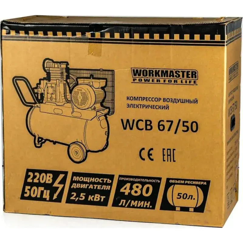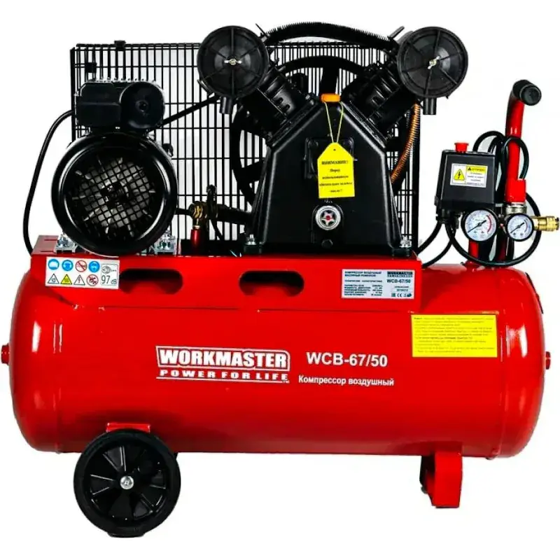 Воздушный компрессор WorkMaster WCB 67/50 используется для производства сжатого воздуха в большом объеме. Конструкция включает в себя ресивер. Это позволяет воспользоваться запасом сжатого воздуха и избежать кратковременных включений двигателя.