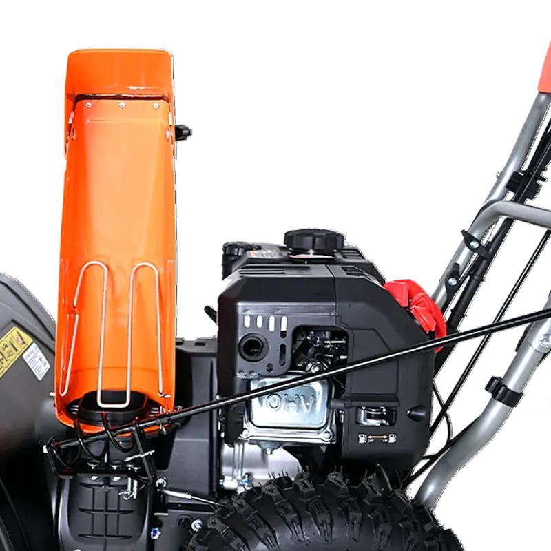 В целях безопасности в желобе установлен снежный рассекатель, задерживающий вылет кусков льда. Засоры и наледи в механизме можно удалять с помощью лопатки, которая прикреплена к рулевой рукоятке и всегда находится под рукой.
