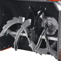 Мощный зубчатый шнек эффективно перемалывает даже плотный снег и наст, а крыльчатка выбрасывает его через желоб на расстояние до 11 метров. Управление поворотом желоба осуществляется прямо с панели оператора – останавливаться для этого не потребуется.