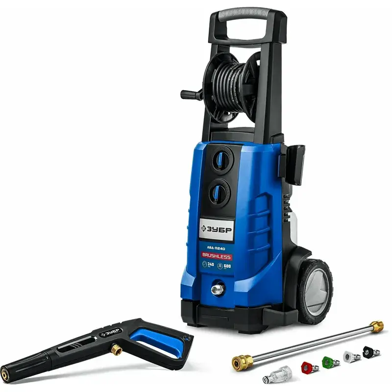 Благодаря барабану шланг можно разматывать на необходимую длину, а по завершении мойки аккуратно сматывать во избежание перегибов и повреждений. Специальные приспособления для намотки кабеля, фиксации пистолета, струйной трубки и прочих аксессуаров обеспечивают порядок на месте проведения работ и компактное хранение мойки ЗУБР АВД-П240.