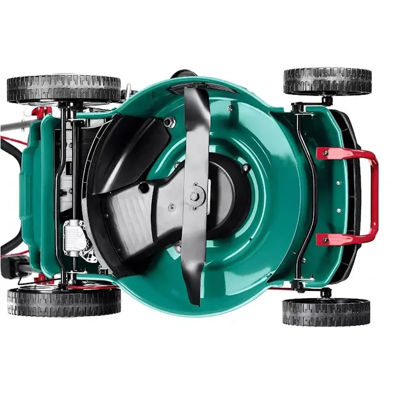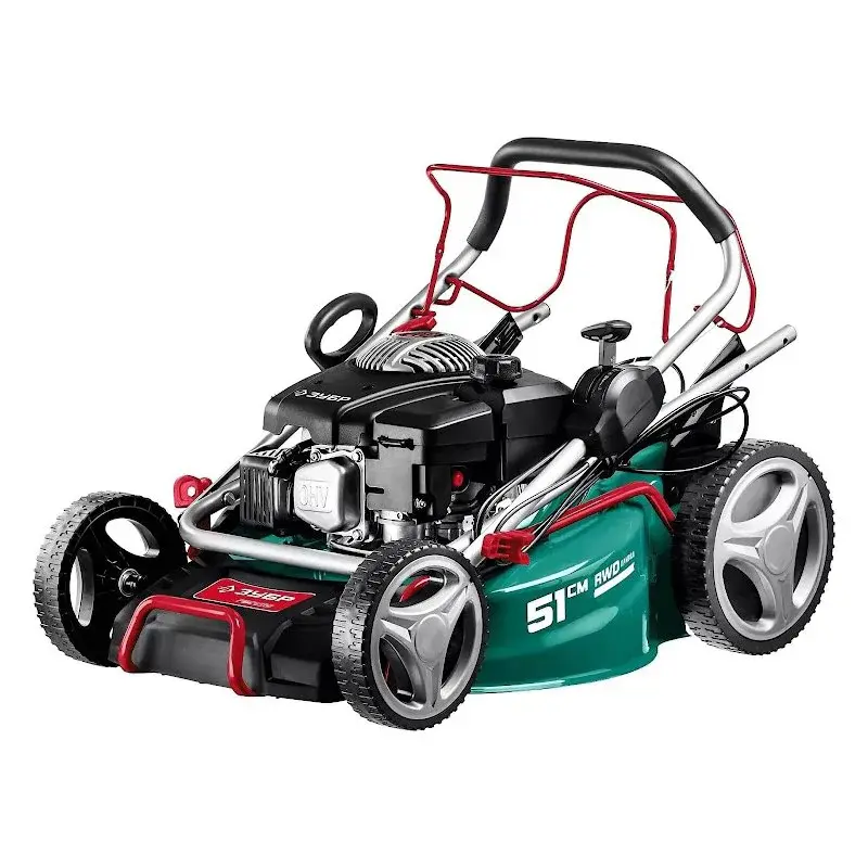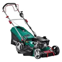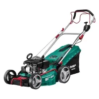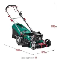 У бензогазонокосилки задний привод. За счет этого обеспечивается работа машины даже на неровных участках, вплоть до угла наклона 20°. Легкий ход машины также обеспечивают колеса с подшипниками.
