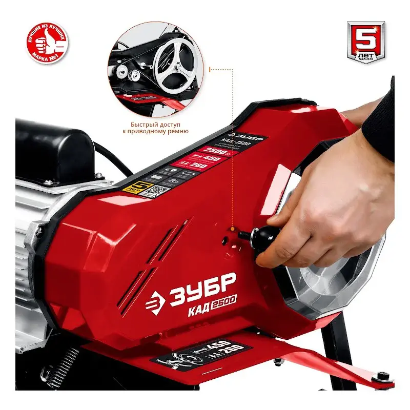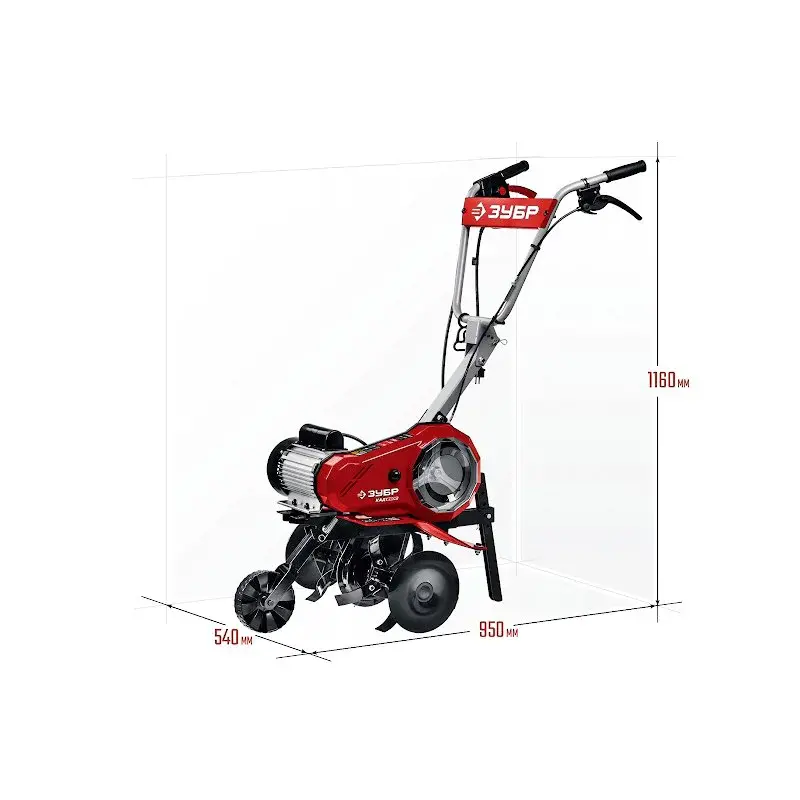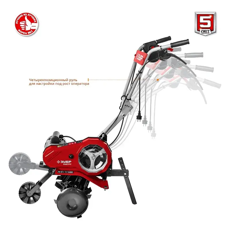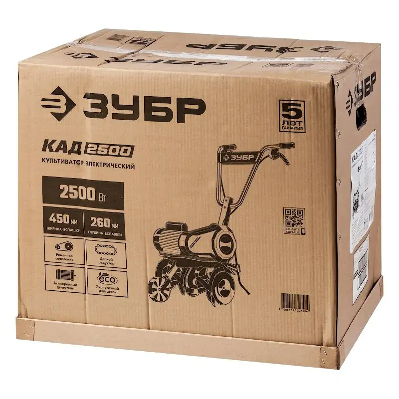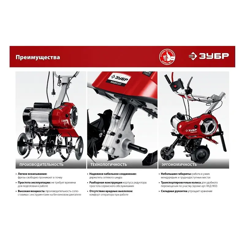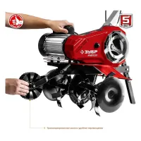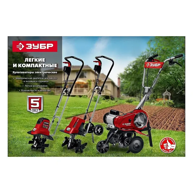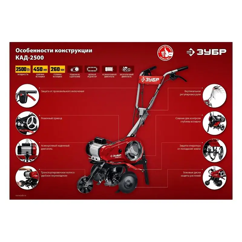 Культиватор электрический ЗУБР КАД-2500 не выделяет вредных выхлопных газов, если сравнивать с бензиновыми аналогами. Двигатель мощностью 2500 Вт подходит для работы на участках площадью до 1000 м2.
