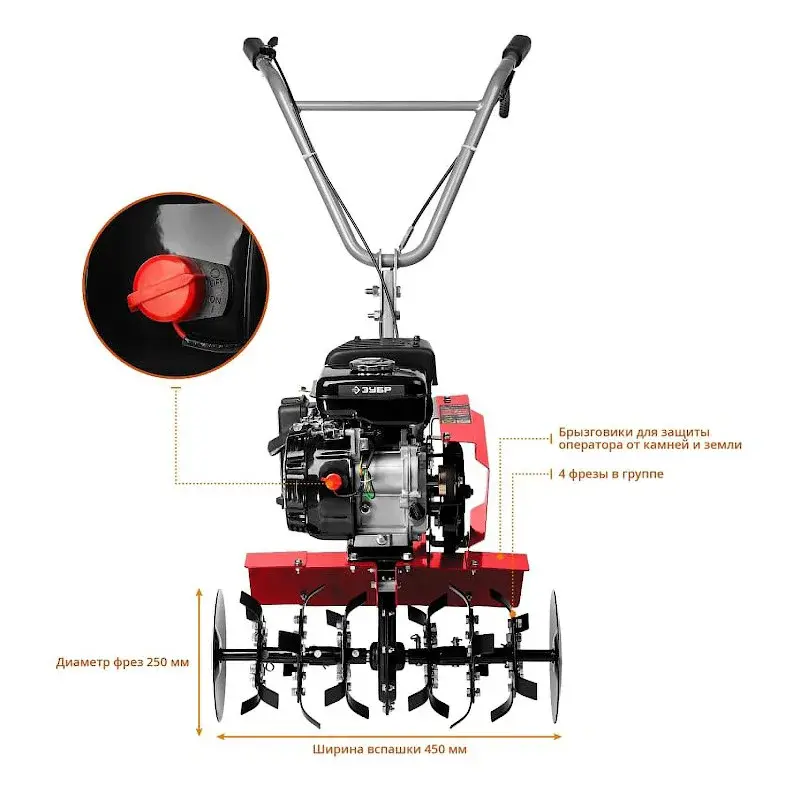 Культиватор бензиновый ЗУБР МКТ-150 обладает шириной обработки 450 мм и используется для вспашки почвы на участке. Машина поставляется с дополнительными комплектующими.
