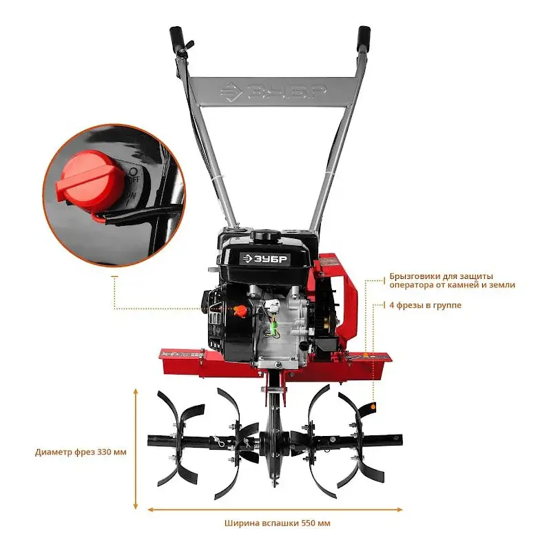 Культиватор бензиновый ЗУБР МКТ-170 с шириной вспашки 550 мм способен эффективно и быстро обработать большой участок площадью до 1500 м2. Машина поставляется с дополнительными принадлежностями для более комфортной эксплуатации.
