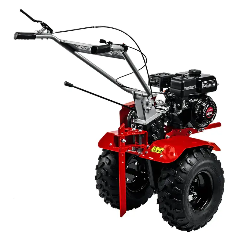 Бензиновый мотоблок оснащен четырехтактным одноцилиндровым двигателем объемом 212 см3 с воздушным охлаждением. Механический шестеренчато-цепной редуктор в чугунном корпусе с масляной ванной позволяет обрабатывать даже тяжелые и каменистые почвы. Крутящий момент от двигателя на редуктор и навесное оборудование передает сцепление с износостойким клиновидным зубчатым ремнем. При объеме бензобака 3,6 л и норме расхода топлива 1,9 л/ч мотоблок почти 2 часа работает без дозаправки.