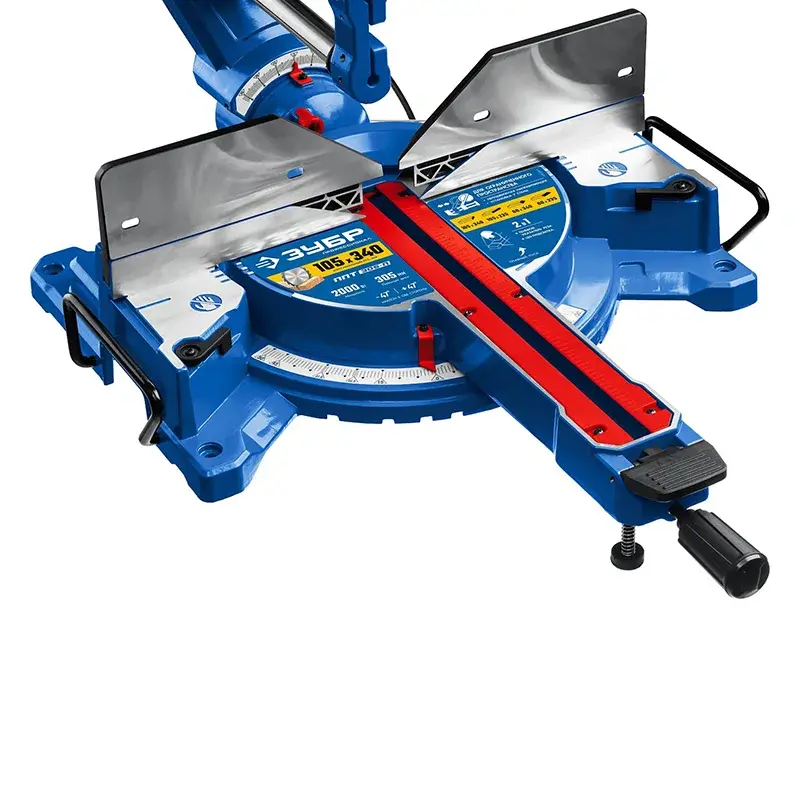 Для работы с крупными заготовками в торцевой пиле ЗУБР ППТ-305-П предусмотрены раздвижные фронтальные упоры и удлинители стола. А для быстрой фиксации изделия предусмотрена быстрозажимная струбцина.