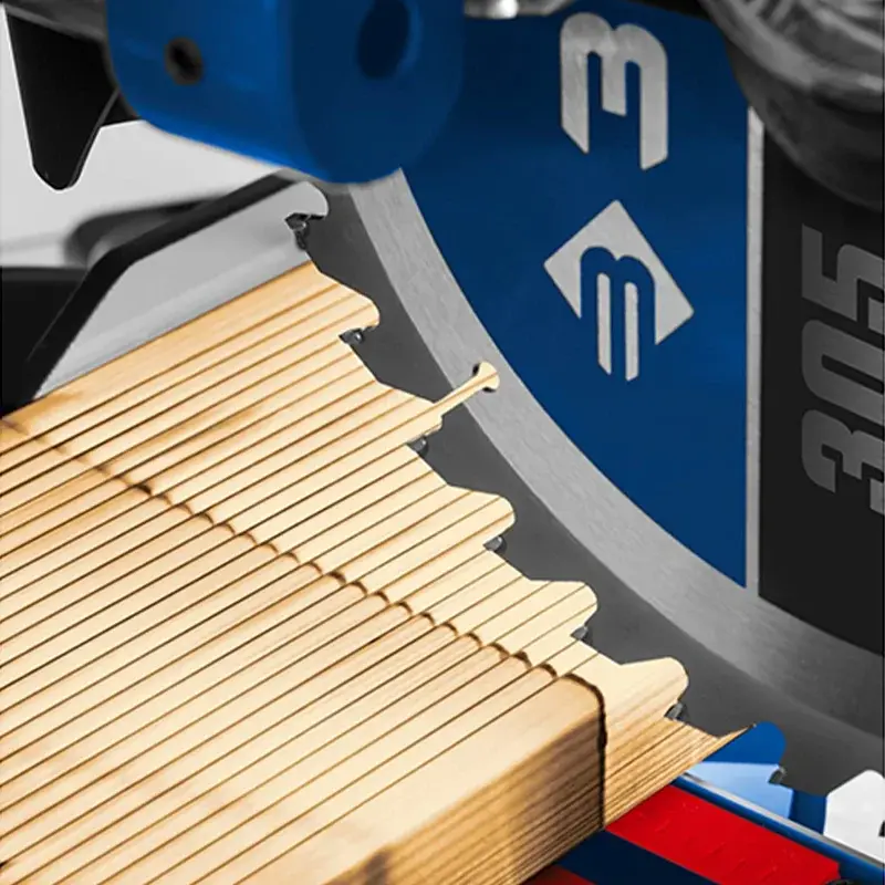 Ширина реза зависит от наклона головки инструмента и перемещения каретки. За счет протяжки максимальное значение под прямым углом достигает 340 мм, а при 45 ° – 235 мм. Это позволит резать профиль, брус и работать с широкими деревянными заготовками.