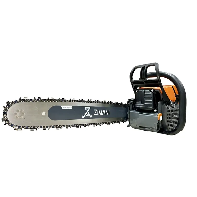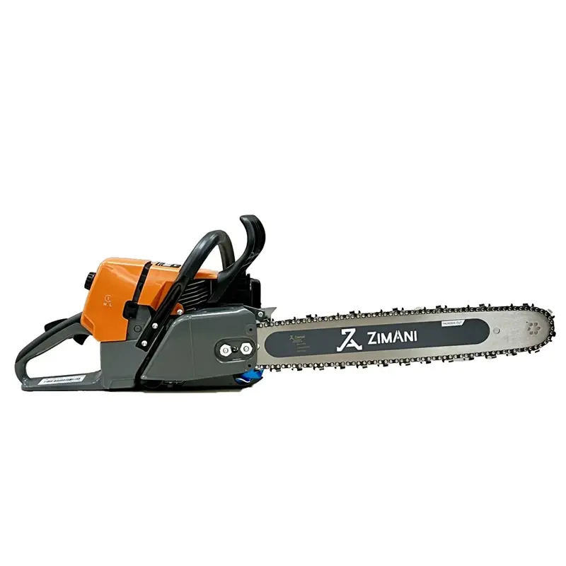 - Ручной тормоз ZimAni SpeedStop. Моментальная остановки цепи, является защитным механизмом для обеспечения высокой безопасности, необходимой при работе с бензопилами. Срабатывает, как механически при нажатии рукой на защитный упор, так и автоматически, при сильной отдаче или падении пилы, практически мгновенно останавливая пильную цепь. Защитная рукоятка тормоза крепится на двух опорах, что обеспечивает надежность и удобство.