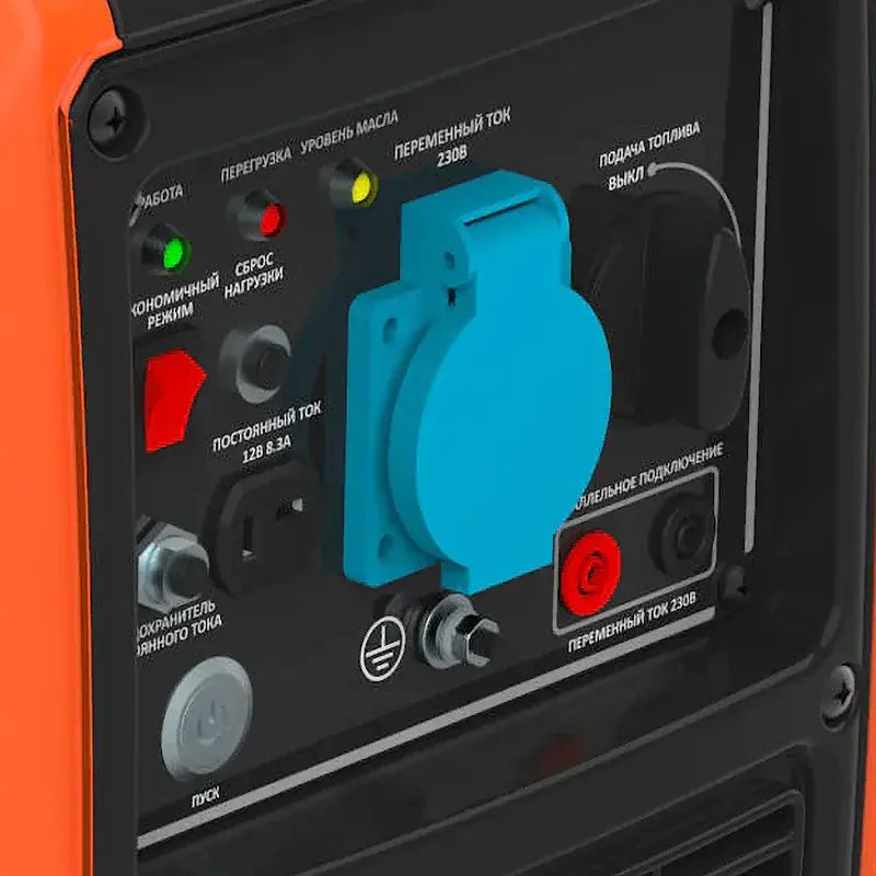 На панели управления размещена розетка на 220 В для подключения бытовых приборов или электроинструмента. Для защиты от пыли и грязи во время хранения она оснащена крышкой. Помимо этого, рядом расположен выход на 12 В, который используется для подзарядки автомобильного аккумулятора.