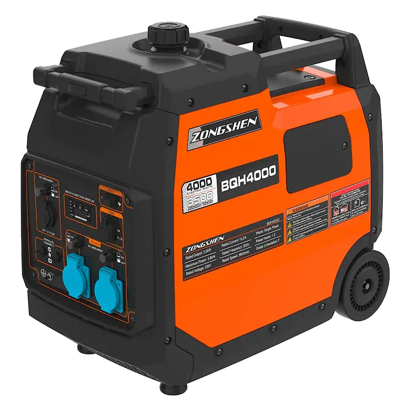 Бензиновый инверторный генератор Zongshen BQH 4000 предназначен для питания однофазных потребителей суммарной мощностью до 3,6 кВт. Для простого перемещения по рабочей площадке предусмотрены транспортировочные колеса.
