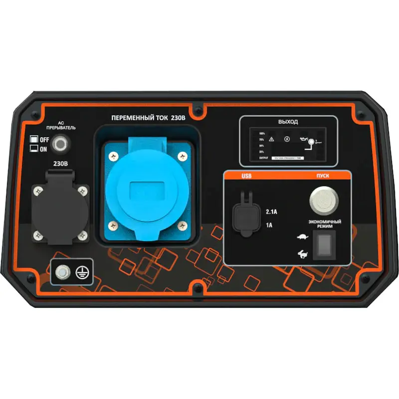 Устройство легко и быстро запускается нажатием кнопки электростартера. Если электрический запуск невозможен из-за низкого заряда АКБ, то бензиновый генератор можно запустить с помощью ручного стартера. Цифровое табло с индикацией помогает отслеживать рабочее состояние электростанции: включение, питание, перегрузку, уровни масла и топлива. В аварийной ситуации происходит автоматическое глушение двигателя и отключение питания потребителей.